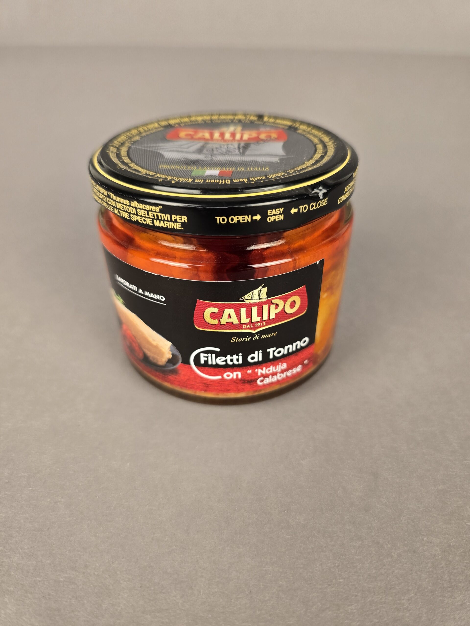 Feinste Gelbflossen-Thunfisch-Filets eingelegt in Olivenöl mit Nduja. Nduja ist ein typisches kalabrisches Produkt aus gehacktem Schweinefleisch, gewürzt mit süss-charfem Chili und Meersalz.