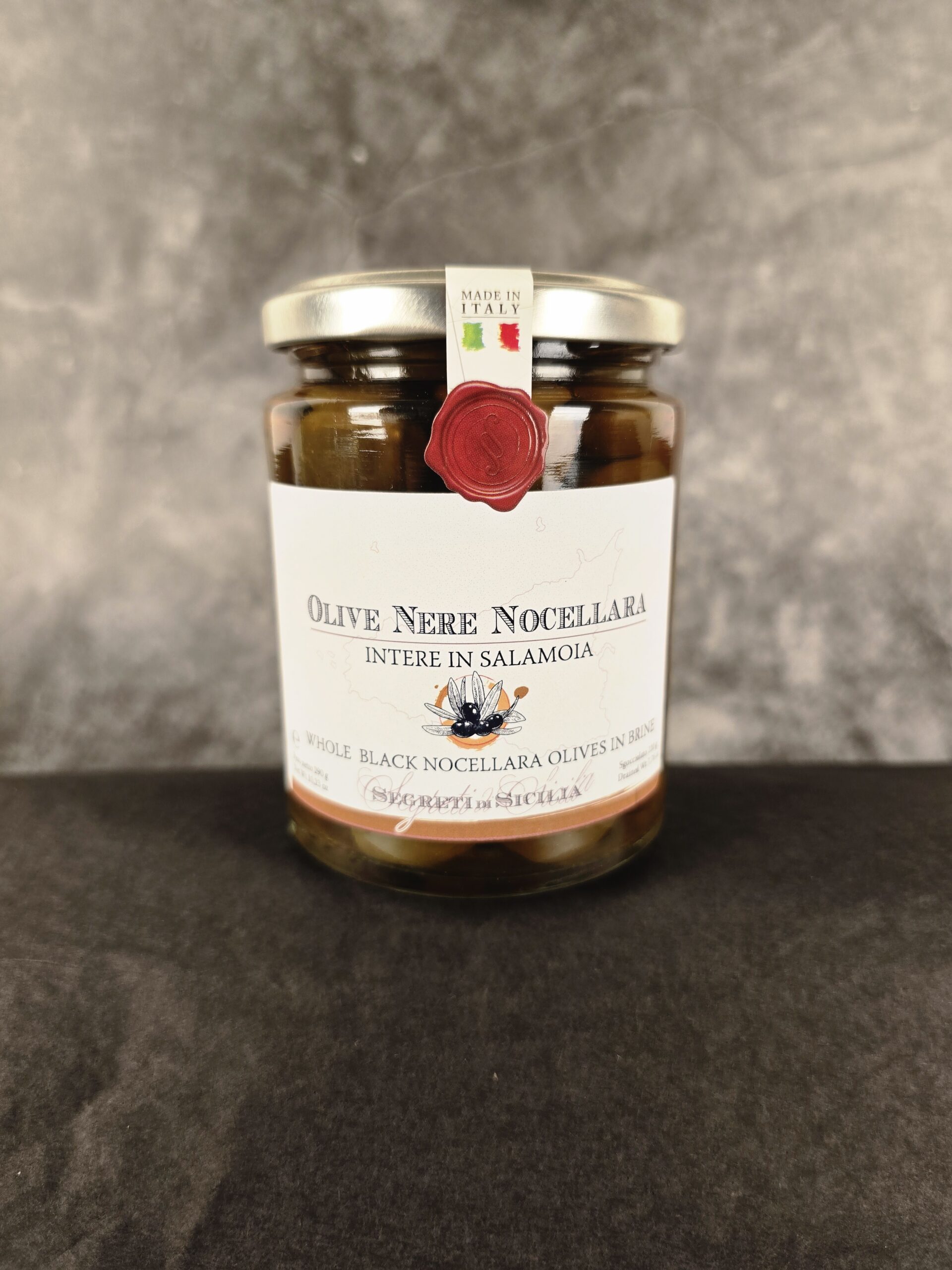 Schwarze Nocellara Oliven im Glas,75% Oliven, Waser und Salz